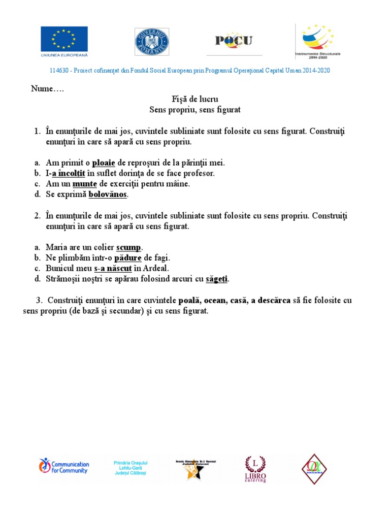 In Sfarsit Acasa Copilul Toamnei Source from : https://copilultoamnei.eu/in-sfarsit-acasa/ Sensul propriu de baza este sensul obisnuit al cuvantului folosit in mod curent, care trezeste in mintea vorbitorului imaginea traita a unui obiect a sensul figurat/conotativ este sensul mai putin obisnuit al cuvintelor folosit cu valoare expresiva pentru a da nastere figurilor de stil (epitet, metafora etc). Sesul figurat (numit sens conotativ): Deputatul independent alexandru oleinic condamnă boicotul ședințelor plenare ale legislativului, organizat de pas, ppda, grupul candu și partidul șor. Scoala gimnaziala lopadea noua grade/level: Avem suport financiar, suport tehnic, suport emoțional și altele.